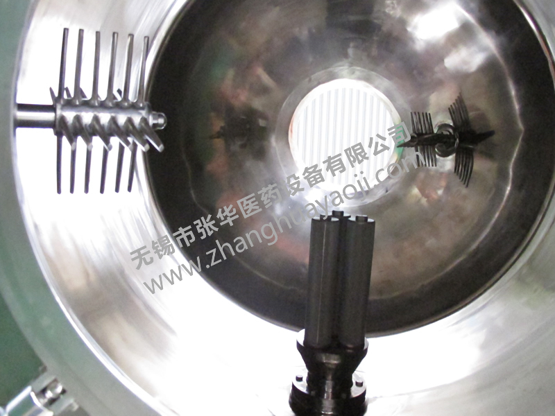 4、幹燥階段:再次抽濾結束後,在抽真空口通入氮氣反吹,使濾餅和過濾網脫離,轉動錐體,在回轉過程中靠破碎器使濾餅破碎,夾套內通入熱水加熱整個錐體。並在真空狀態下使物料達到幹燥目的。並可進行原位取樣過程。通過旋風分離器捕集微粉,並可由冷凝器收集有機溶劑。