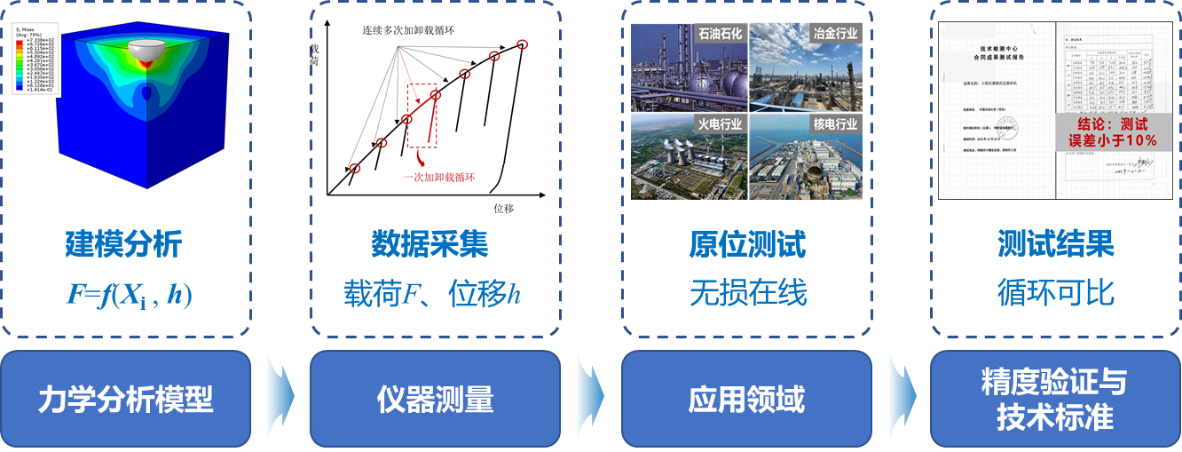 金屬材料是工業生產的重要物質基礎,其性能直接影響著天然氣、石油石化、航空航天、電力冶金、風電、火電、核電、鐵路船舶等領域設備設施的安全運行。隨著服役時長的增長,設備材料的力學性能不可避免的劣化,嚴重威脅設備的運行安全,因此進行材料的力學性能評估具有重要意義。傳統的評價方法如拉伸試驗、疲勞試驗、斷裂韌性試驗等製作試樣會對設備造成破壞,需要停機檢測,並且檢測時間長、效率低、不能進行現場測試,所以往往無法被接受。在此情況下,微損原位檢測服役設備的壓痕法應運而生。壓痕檢測方法從硬度測試開始不斷發展延伸,目前已經可以實現材料拉伸性能、殘餘應力、斷裂韌性等多個力學性能參數的測量。