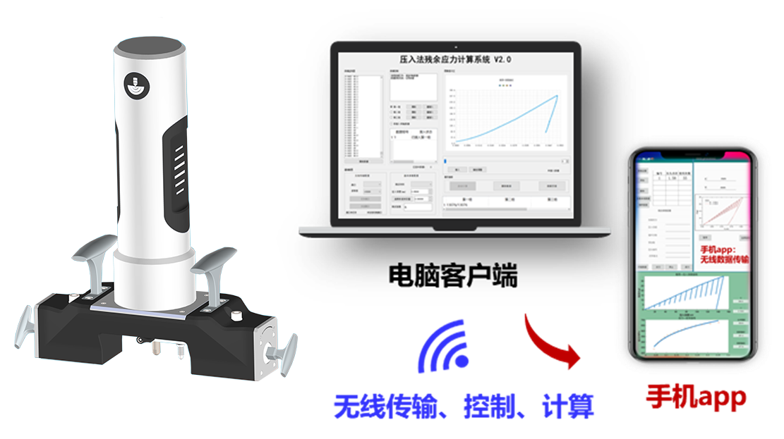 采用無線和有線兩套控製和數據傳輸係統,適用於多種測試環境。有線測試係統采用液晶觸摸屏菜單方式進行參數設置及壓入控製,控製盒小巧輕便,操作方便,可使用電池供電,無懼野外環境,數據實時儲存於SD卡。無線測試係統可通過手機app和電腦軟件遠程控製,數據實時傳輸到軟件,大大減小控製盒體積,更加便攜,方便特殊位置測量。數據傳輸到軟件實時進行處理計算,直接一鍵出具力學性能及殘餘應力結果,實現了數據的快速計算及力學性能參數的可視化。